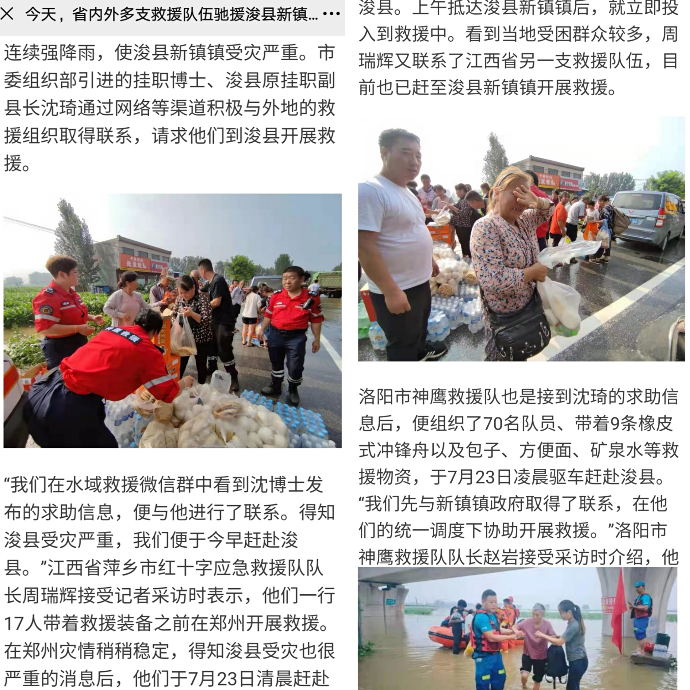 公司博士、浚县原挂职副县长沈琦,在挂职工作即将结束之时,忧心受灾群众,通过网络平台发布浚县的汛情和求助信息后,联系多 支救援队伍一起,帮助被困群众安全转移; 商丘分公司经理孙传华,作为一名退伍兵,他退伍不褪色,脱下军服仍心系民生,捐资筹物一卡车,从商丘连夜送至郑州; 洛阳分公司同事们心系灾情,默默奉献,向洛阳市慈善总会爱心捐款5000元;